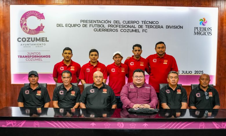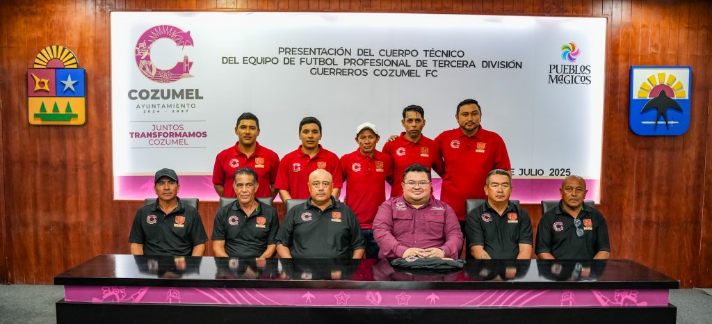Cozumel, a 25 de julio de 2025.- El gobierno municipal que encabeza José Luis Chacón Méndez, junto al director deportivo del club, Manuel García Valdés, presentó en conferencia de prensa al cuerpo técnico del equipo de fútbol profesional de tercera división Guerreros Cozumel FC, como parte del compromiso de la administración actual con el fortalecimiento del deporte y el impulso a los equipos semiprofesionales.