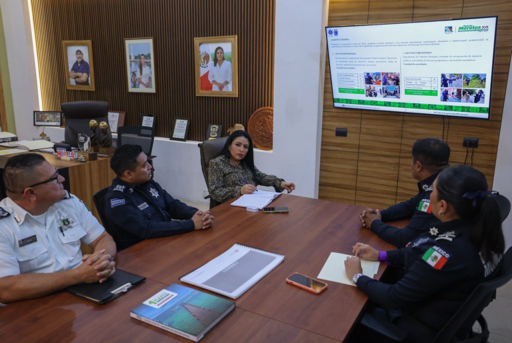 Puerto Morelos, Quintana Roo, 1 de abril de 2026.— Como parte de las acciones para garantizar la paz y el orden público en el municipio, la presidenta Blanca Merari Tziu llevó a cabo la reunión trimestral de evaluación de la Secretaría de Seguridad Ciudadana, encabezada por el titular de la corporación, Tte. de Navío Alejandro Nava García, junto con su equipo de directores, quienes presentaron avances, trabajos realizados y resultados obtenidos en lo que va de 2026.