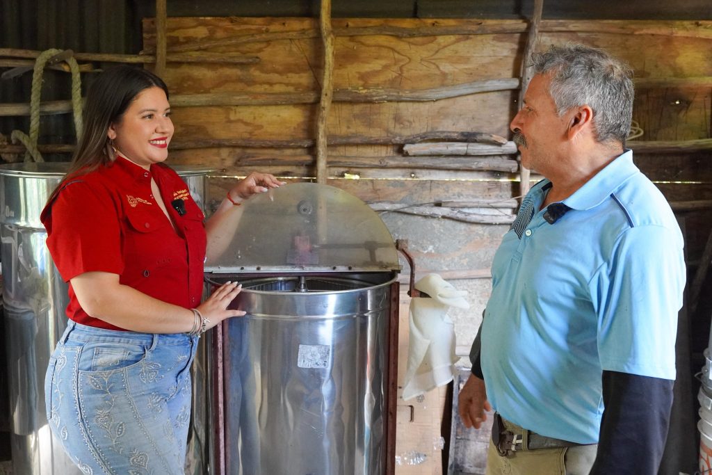 Durante la jornada, la funcionaria, acompañada por el director Agropecuario y Pesquero, Alejandro López, visitó unidades de producción, donde productores compartieron experiencias sobre el manejo de colmenas, el proceso de producción de miel y sus derivados, así como técnicas para la protección de las abejas.